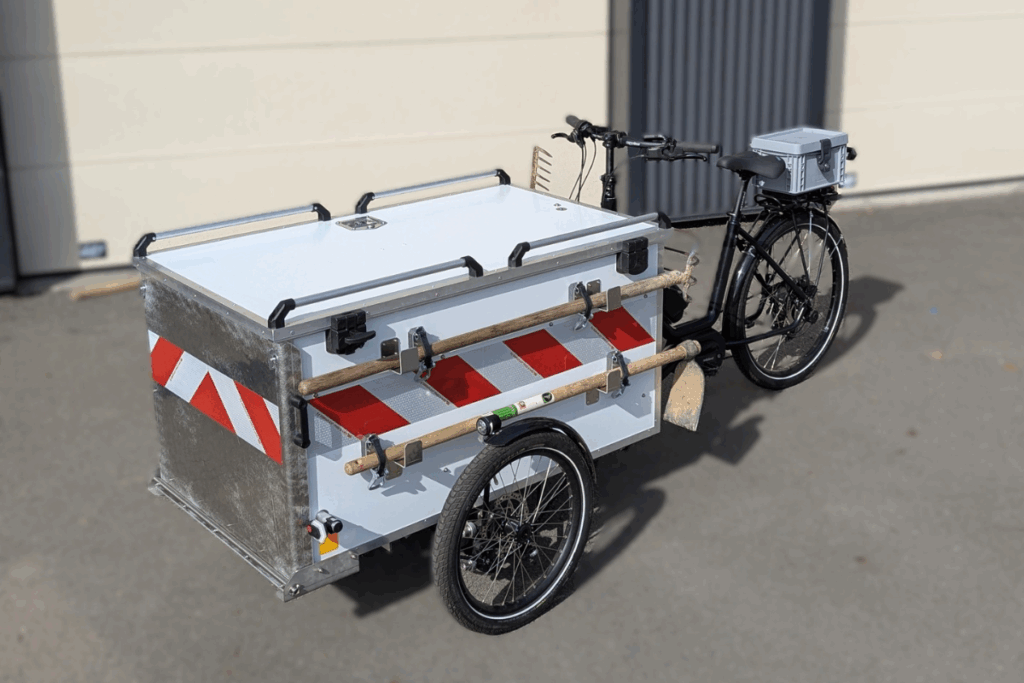 Ce vélo-cargo est également pensé pour la sécurité et la praticité : il intègre des rails modulaires avec tendeurs réglables pour l’arrimage sécurisé du matériel, y compris le transport de 4 outils à manche sans bruit excessif, même sur une chaussée ou chemin irrégulier. Pour renforcer la visibilité et la sécurité, il est équipé de clignotants, avertisseurs sonores et de bandes réfléchissantes.